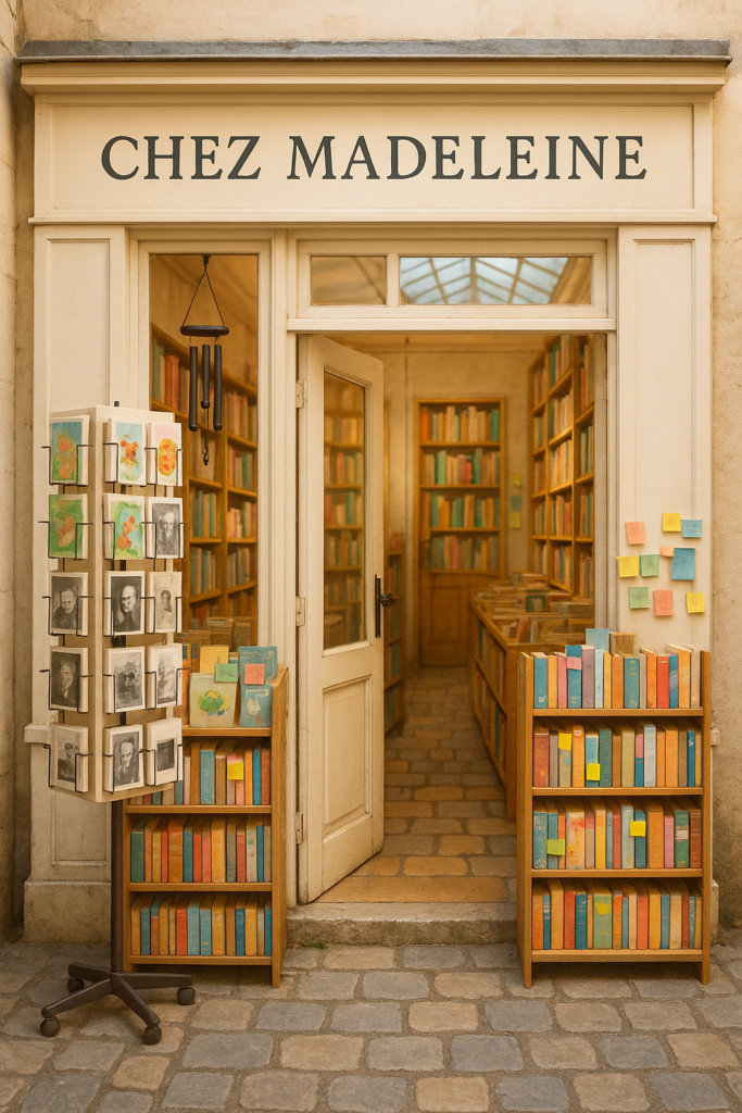 Les rayonnages, légèrement de travers, débordent de romans, de carnets et de cartes illustrées. Rien n’est vraiment rangé… et pourtant tout semble à sa place. Sur certains ouvrages, un petit post-it jaune, griffonné à la main, indique : « Celui-ci m’a tenue éveillée toute la nuit » ou « À lire quand on a besoin d’espoir ».